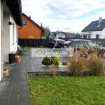 Podjazd i opaska wokół domu wykonane są z estetycznej kostki brukowej. Całość prezentuje się nowocześnie i schludnie.